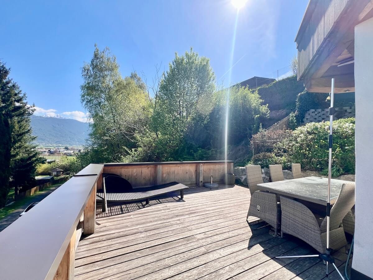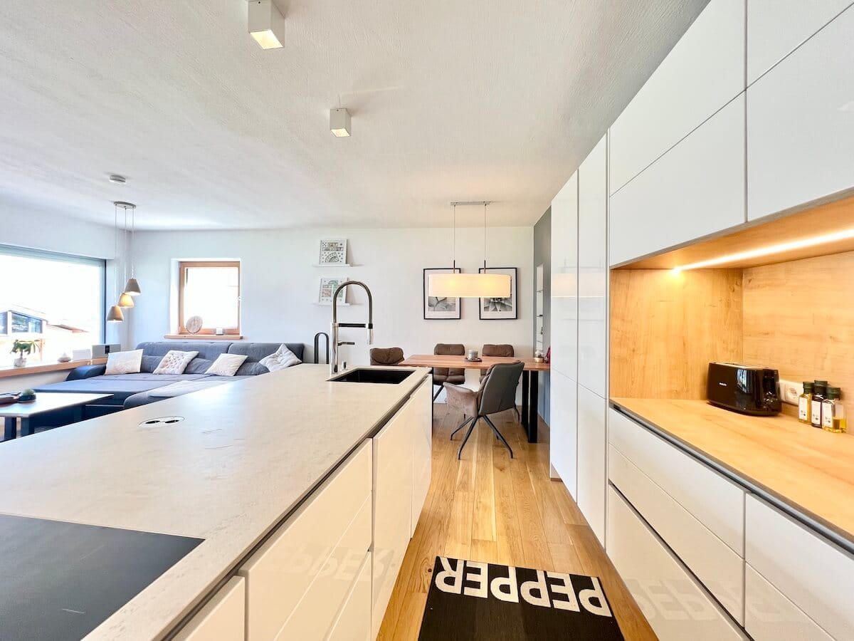 Das Herzstück der Wohnung bildet der offen gestaltete Wohn- und Essbereich mit integrierter Küche. Großzügige Fensterflächen sorgen für ein helles, freundliches Wohngefühl und schaffen eine einladende Atmosphäre. Von hier aus gelangen Sie direkt auf den nordöstlich ausgerichteten Balkon bzw. die Terrasse, die mit einem beeindruckenden Blick auf die umliegende Berglandschaft überzeugen. Ob entspannte Stunden im Freien oder gesellige Abende – dieser Außenbereich erweitert den Wohnraum auf besonders attraktive Weise.
