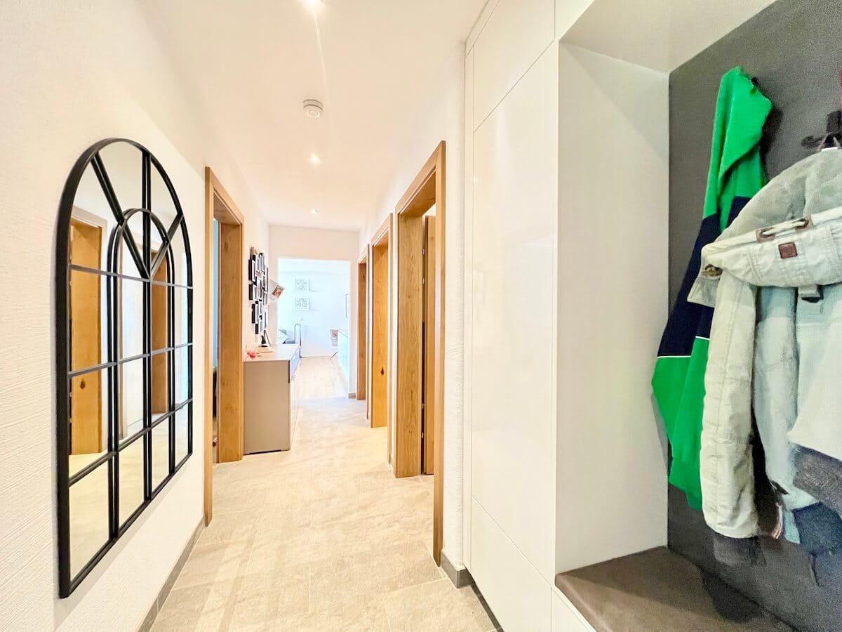 Der Zugang erfolgt aufgrund der Hanglage komfortabel über den nördlich gelegenen Haupteingang im Kellergeschoss oder direkt von der Tiefgarage aus. Von dort gelangen Sie über ein helles, innenliegendes Treppenhaus, das alle Ebenen miteinander verbindet, in die Wohnung. Bereits beim Eintreten empfängt Sie ein großzügiger, zentral angelegter Eingangsbereich mit Garderobe, von dem aus sämtliche Räume bequem erschlossen werden.